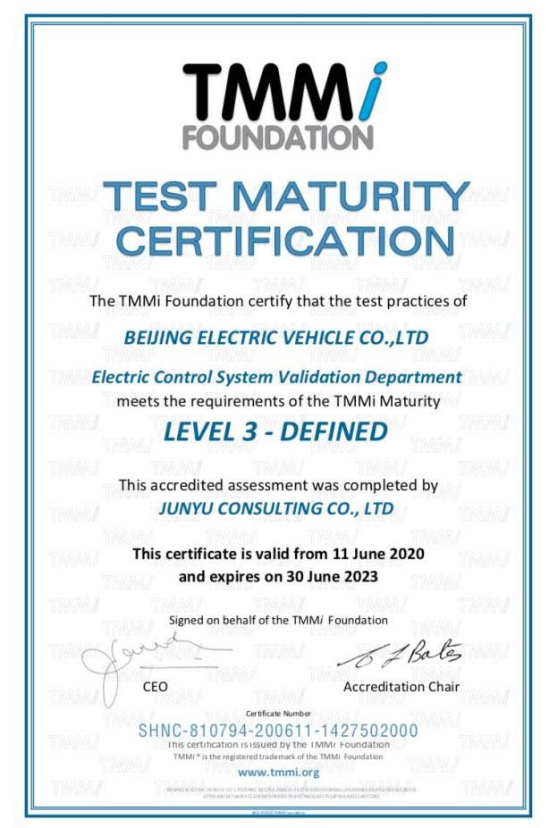 BAIC Electric Vehicle Engineering Research Institute officially received the TMMi Level 3 Certification from the TMMi Foundation with the highest score that all certification items are “fully satisfied” at the iSQE Software Quality Engineering Summit held on October 23, 2020. In result, the Institute became the first test organization receiving the TMMi Level 3 Certification in the international auto industry. BAIC Electric Vehicle received the TMMi Best Practice Organization Award, and Dai Kangwei, Vice President of BAIC Electric Vehicle Engineering Research Institute, received the Individual Award for Outstanding Contribution at the Summit. BAIC Electric Vehicle keep leading electronic control technology of new energy vehicles, as the first automaker participating in the international software testing certification and process improvement certification.