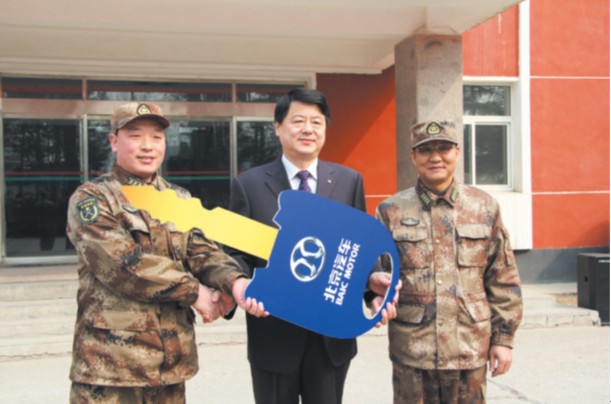 北京股份公司3月26日向駐守在順義的北京衛(wèi)戍區(qū)66168 部隊(duì)贈(zèng)送6輛“勇士”軍車儀式在66168部隊(duì)舉行。北汽股份總裁韓永貴、北京分公司領(lǐng)導(dǎo)參加了交車儀式。